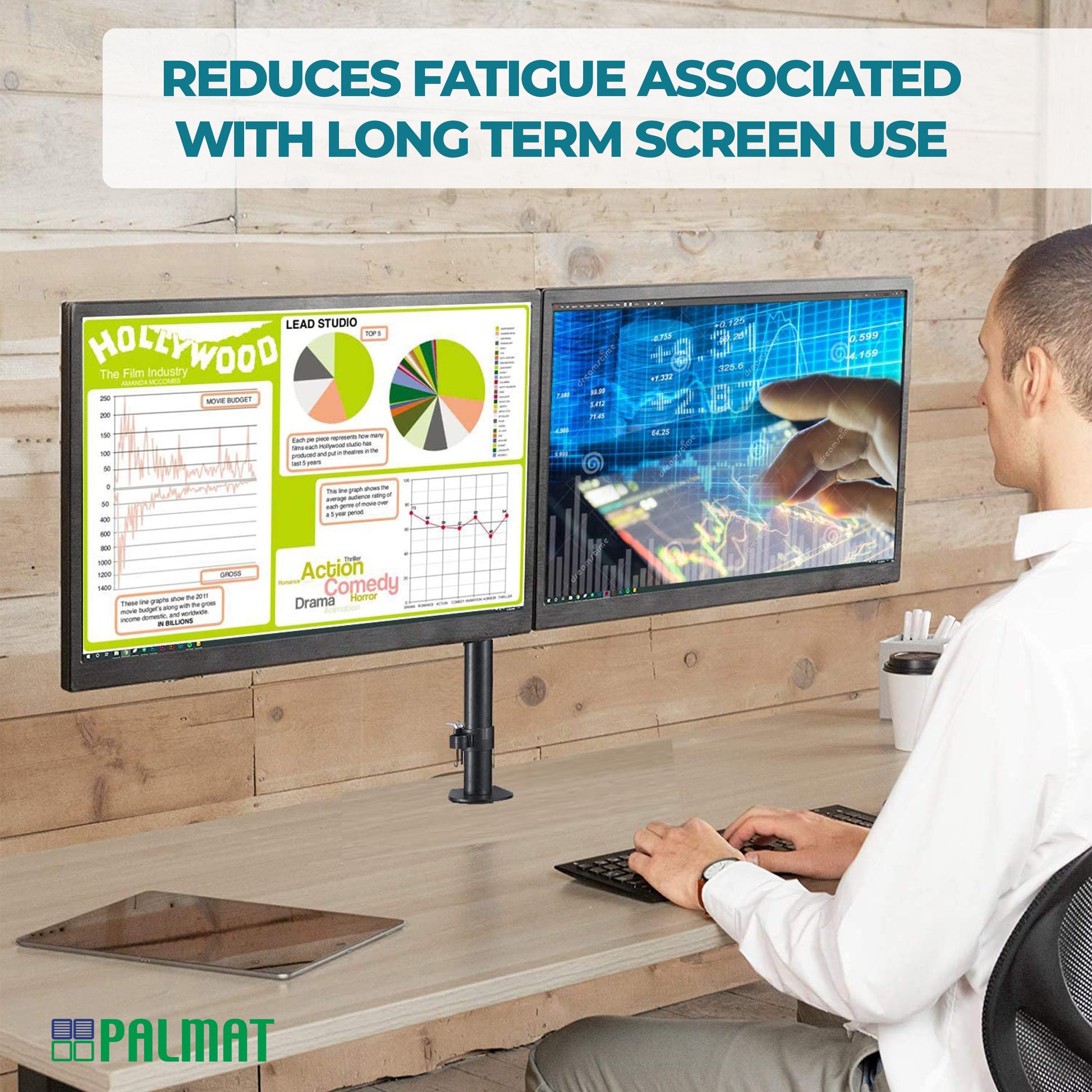 Deze PALMAT Dual Arm Monitor Mount is 360° draaibaar en daardoor zeer flexibel en ergonomisch en helpt de vermoeidheid bij langdurig beeldschermgebruik te verminderen. De VESA monitorstandaard is gemaakt van hoogwaardig aluminium en staallegering waardoor hij sterk en betrouwbaar is. De flexibele positionering heeft een kantelbereik van +15°/-15° en 360° draai- en zwenkbereik.