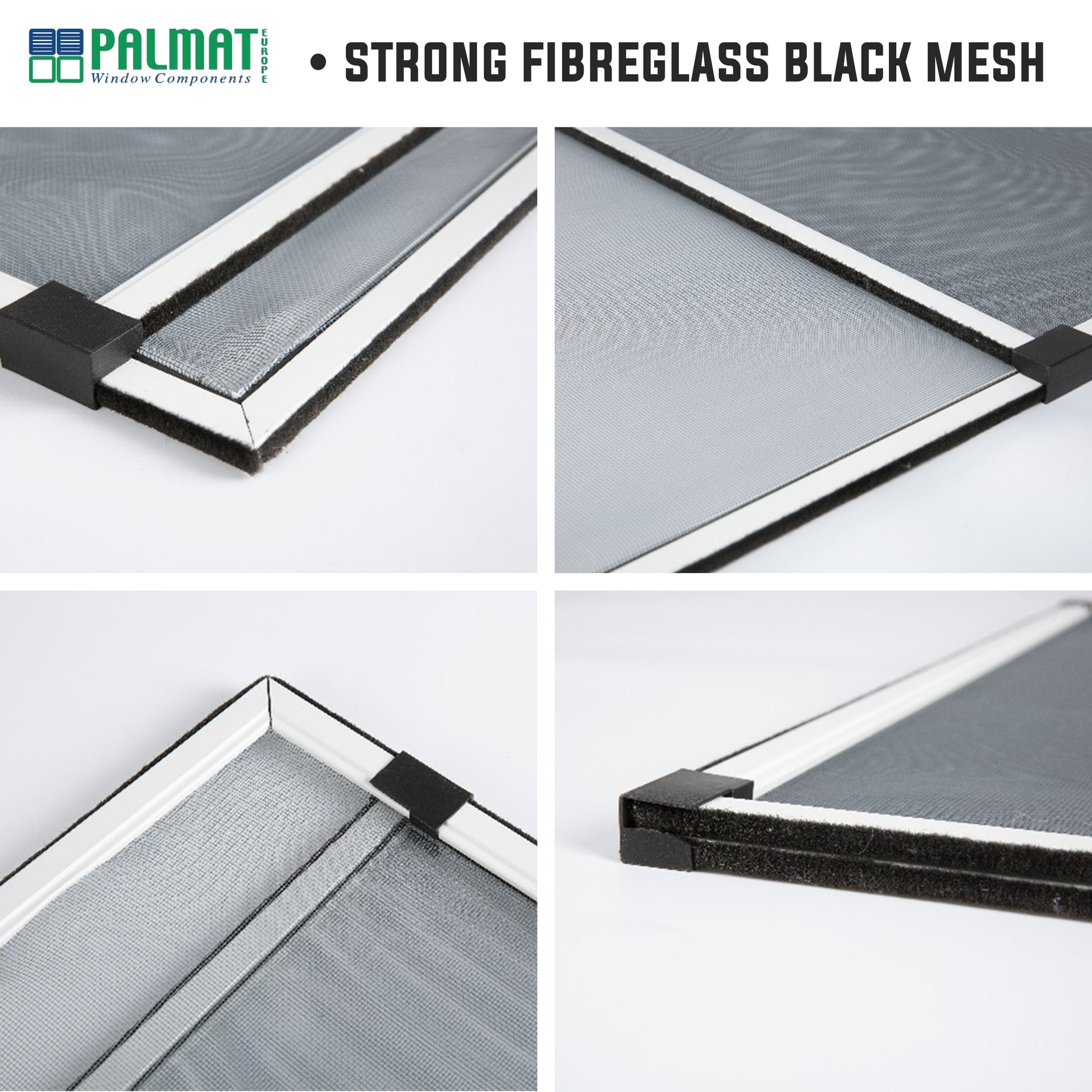 The strong fibreglass black mesh is provided with brush seals on every side, which increases the fit accuracy on the window frame and prevents even the smallest crawling animals from coming through the mesh.